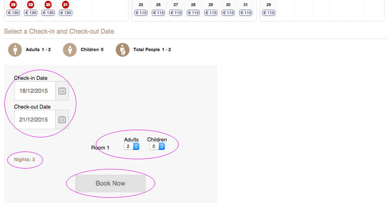 4/ Si vous avez cliqué sur une date à la page précédente, votre date d'arrivée sera déjà choisie. Il vous sufira donc de choisir votre date de départ et le nombre de personnes.